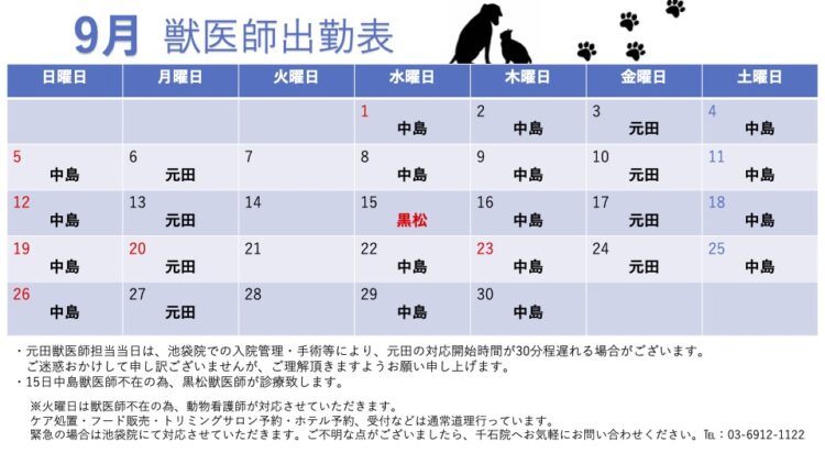 遅くなりましたが、9月の獣医師勤務表をご案内させていただきます。