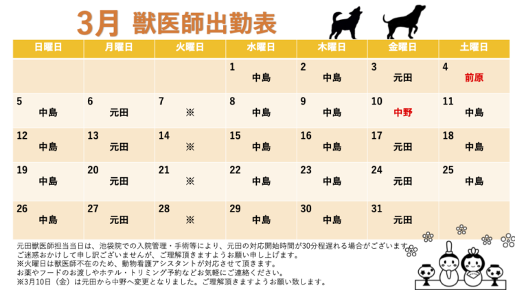 3月10日(金)の出勤獣医師が元田から中野へ変更となりました。