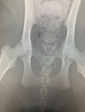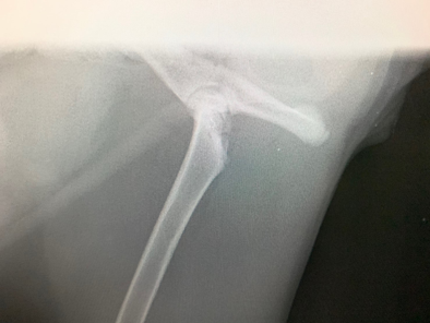 この子はレントゲンで骨頭上に骨折ラインが見られるが、これは成長線であると判断しました。