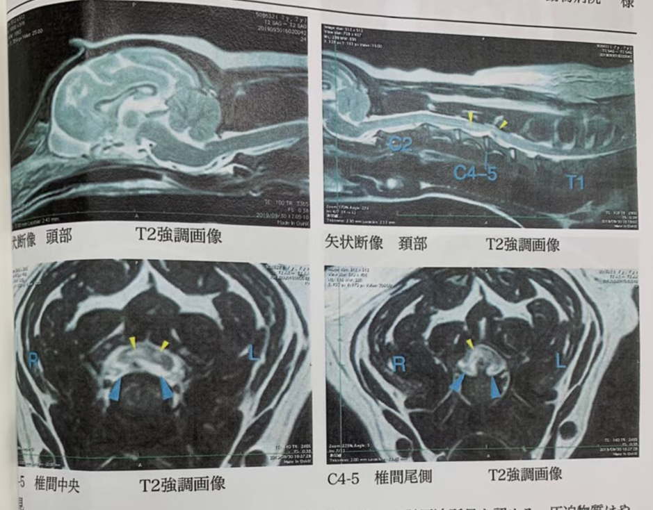 結果より頸部椎間板ヘルニアが確定され、 外科的治療である腹側減圧術(ベントラルスロット術)を実施