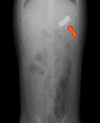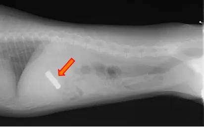 レントゲン検査の結果、胃の中に白い影(矢印)がありました。
